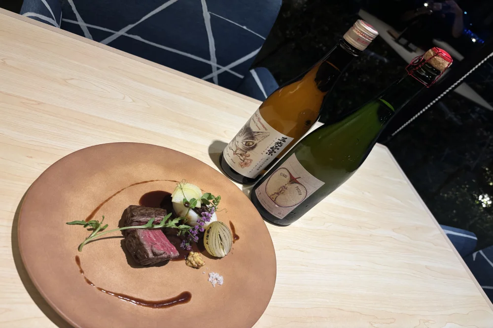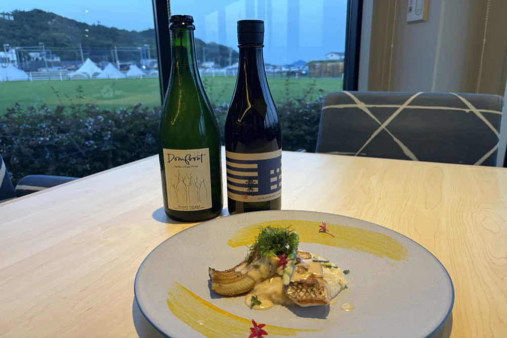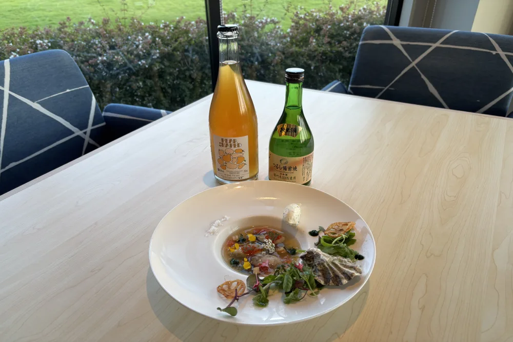 Le Chef français Nicolas Leseur s’est allié au chef du Restaurant Bluno, M.Nakayama pour concocter ce dîner d’exception : tout a été réfléchi dans les moindres détails pour mettre en valeur les ingrédients de la préfecture d’Okayama et de la Mer Intérieure de Seto, des huîtres en entrée aux fruits d’Okayama au dessert, pour un repas en 4 temps dévoilant toute leur richesse. Chacun de ces plats extraordinaire fut accompagné par non pas un, mais deux accords bien singuliers. Le sommelier Disciple d’Escoffier Ludovic Mandine, fit voyager les participants en leur faisant découvrir non seulement les sakés d’Okayama, Maison Sanko Masamune, Maison Itano, Maison Muromachi et Maison Kamikokoro étaient au rendez-vous, mais aussi les cidres de Normandie de Jérôme Forget. Chaque plat était donc servi avec un alcool japonais, saké ou liqueur et un cidre normand, formant une combinaisons singulière qui a révélé le meilleur de chaque plat.