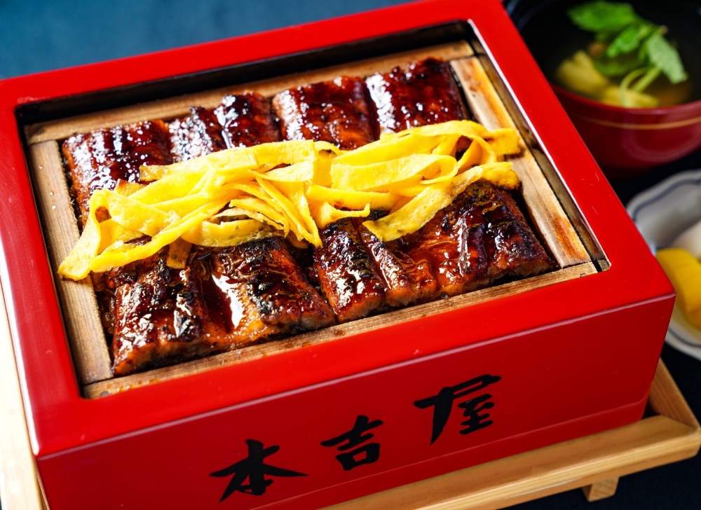 Il est possible d’opter pour un menu plus ou moins copieux, en choisissant une ou deux couches de filets d’anguille grillée. Une soupe claire au foie d’anguille (kimosui), une salade vinaigrée (sunomono), du daikon rapé (shirayaki oroshi) et des légumes marinés (kōmono‑tsuki) accompagnent le repas au choix.